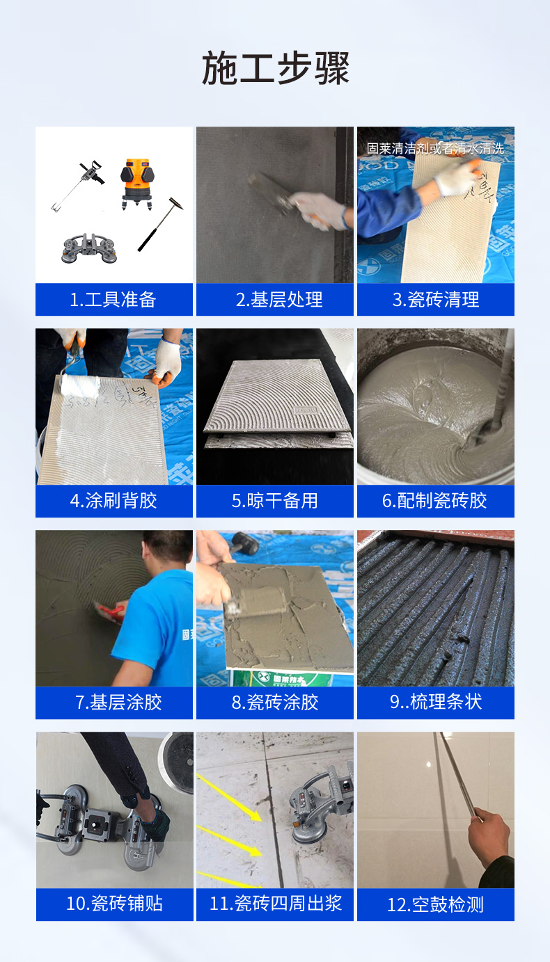 产品描叙:固莱瓷砖粘结剂是一种品质环保型聚合物改性的水泥基复合粘结材料,是由高标水泥、级配砂、再分散乳胶粉和其它添加剂等配制而成。