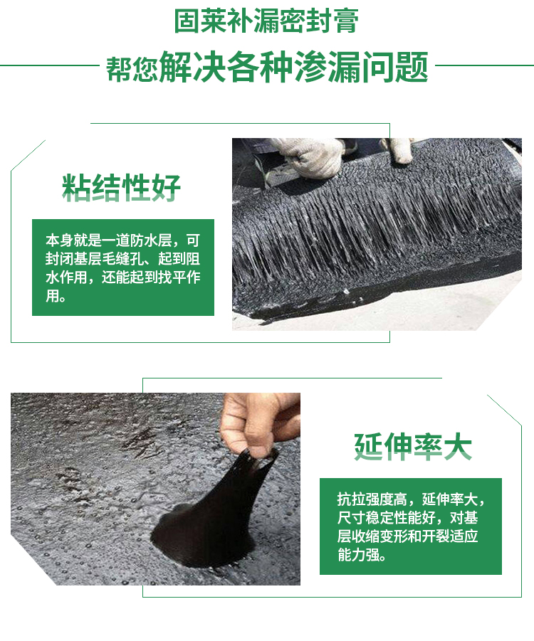 产品描叙:固莱补漏密封膏以多元共聚高分子乳液为基料,添加多种助剂、填充剂、抗裂纤维等经科学加工而成的一种高强度高弹性水性高分子修补密封涂料。产品为膏状、绿色环保、防水性能好。施工后可固化成高弹性高强度的整体无接缝涂膜防水层,特别适用于防水节点的密封如:塑料金属等管根节点处理混凝土结构裂缝修补处理卷材接边及其他防水施工缺陷部位加强处理,另外可用于窗户边沿缝隙的密封。